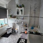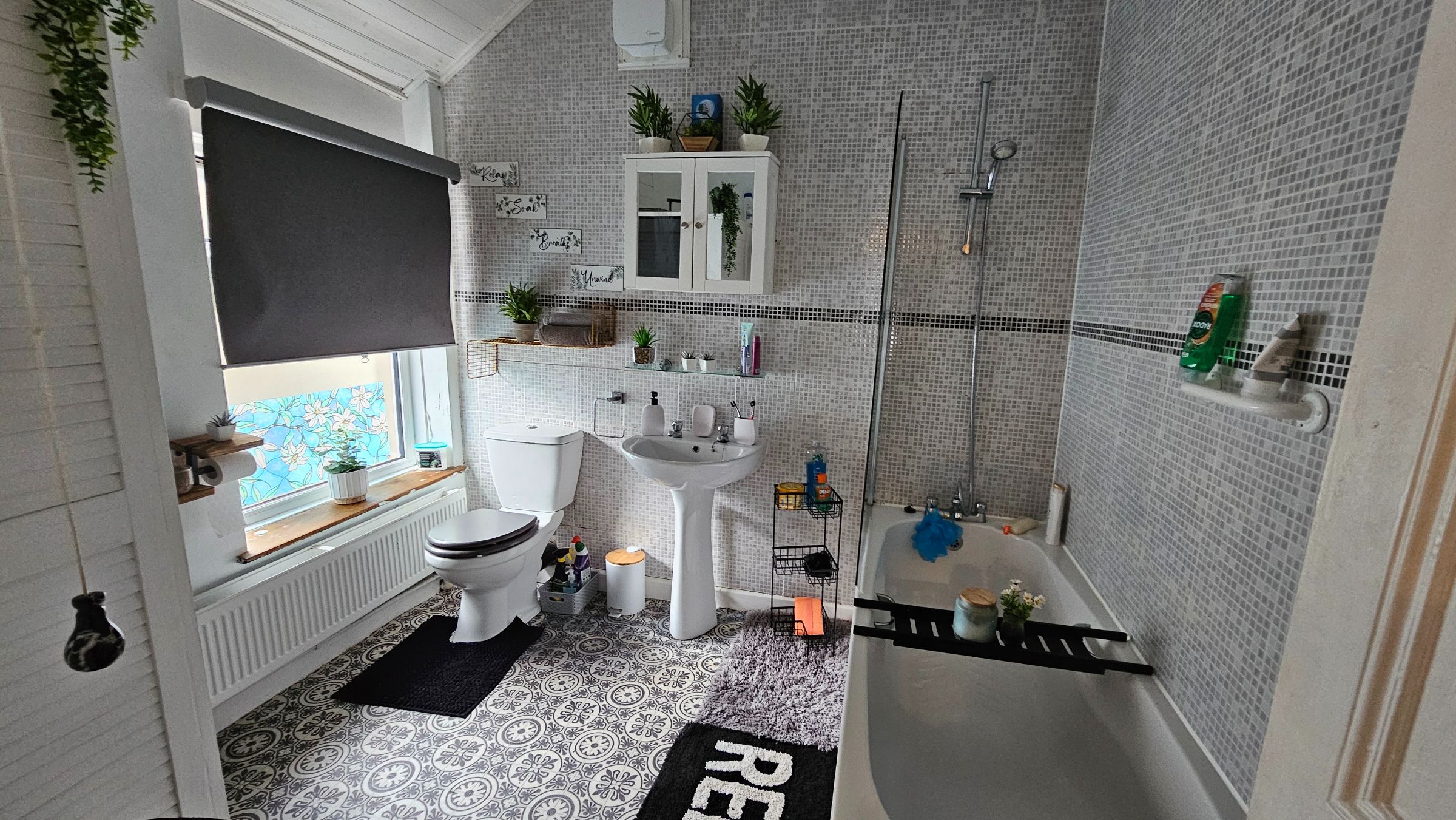 Bathroom suite includes a full bath with mixer tap shower, pedestal washbasin and W.C