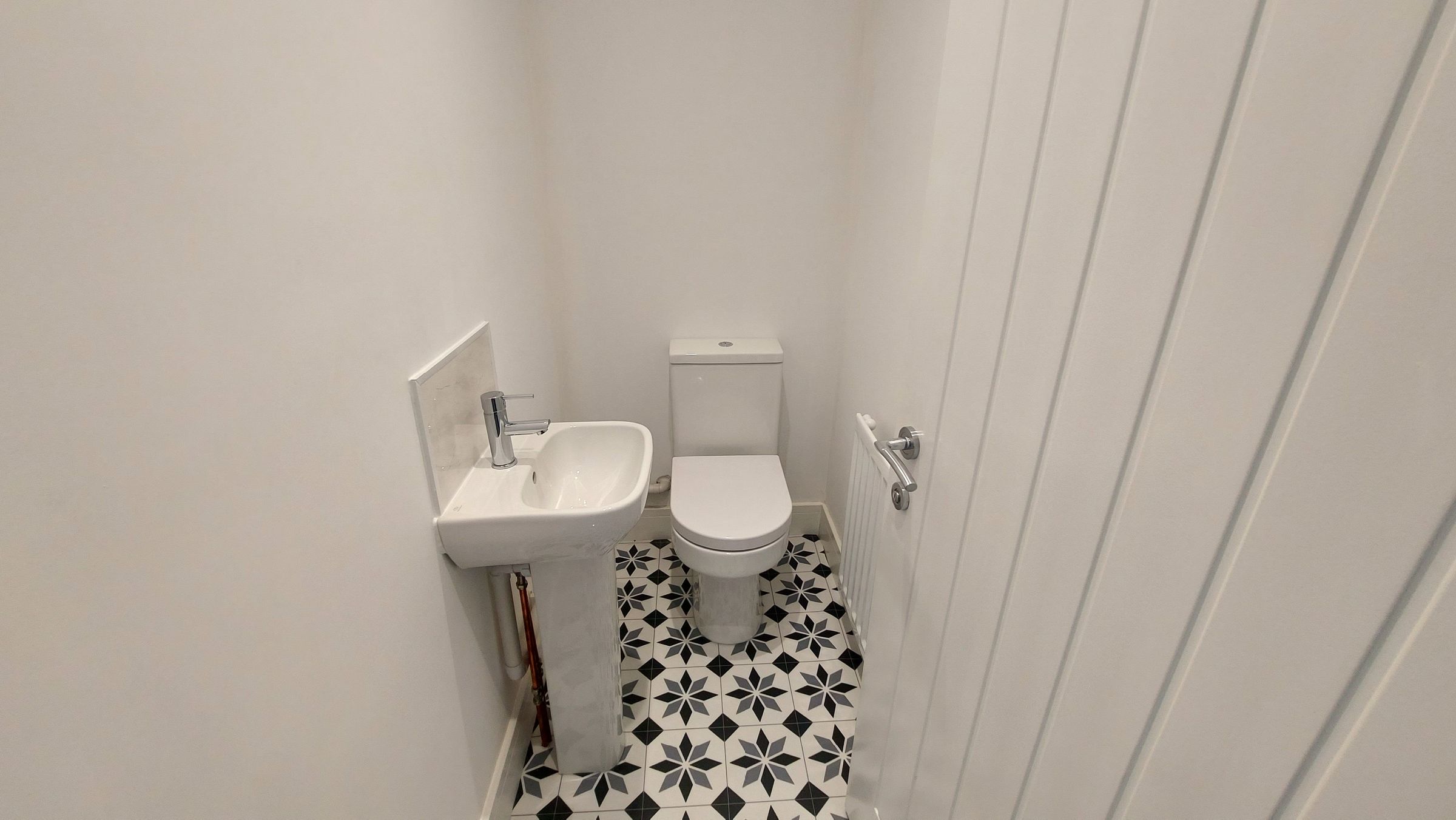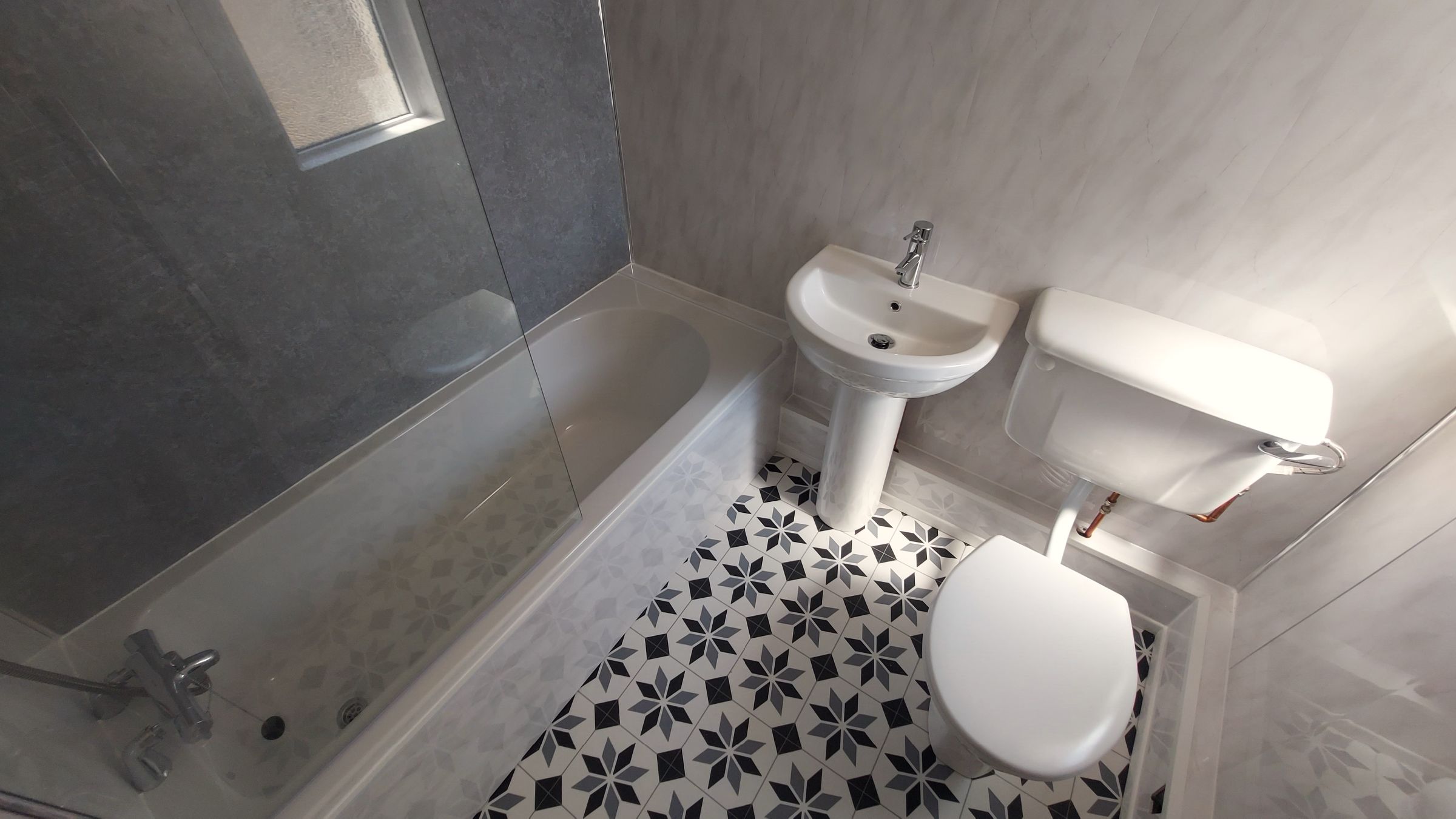 Smooth plastered ceiling, plastic panelling to walls, vinyl flooring, UPVC double glazed window to side, chrome ladder style radiator.
