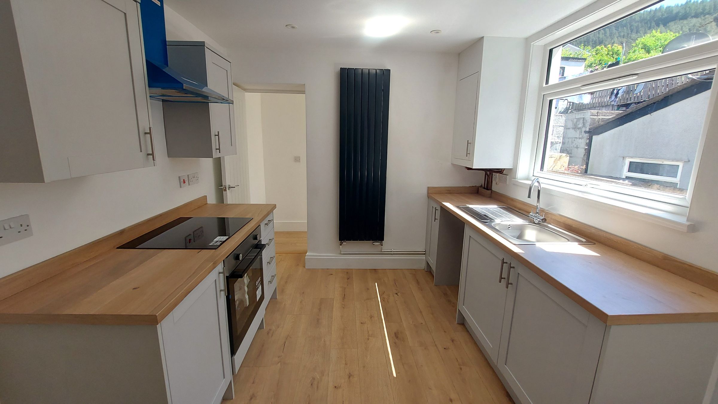 Smooth plastered ceiling and walls, wood effect laminate flooring, UPVC double glazed window to rear, radiator