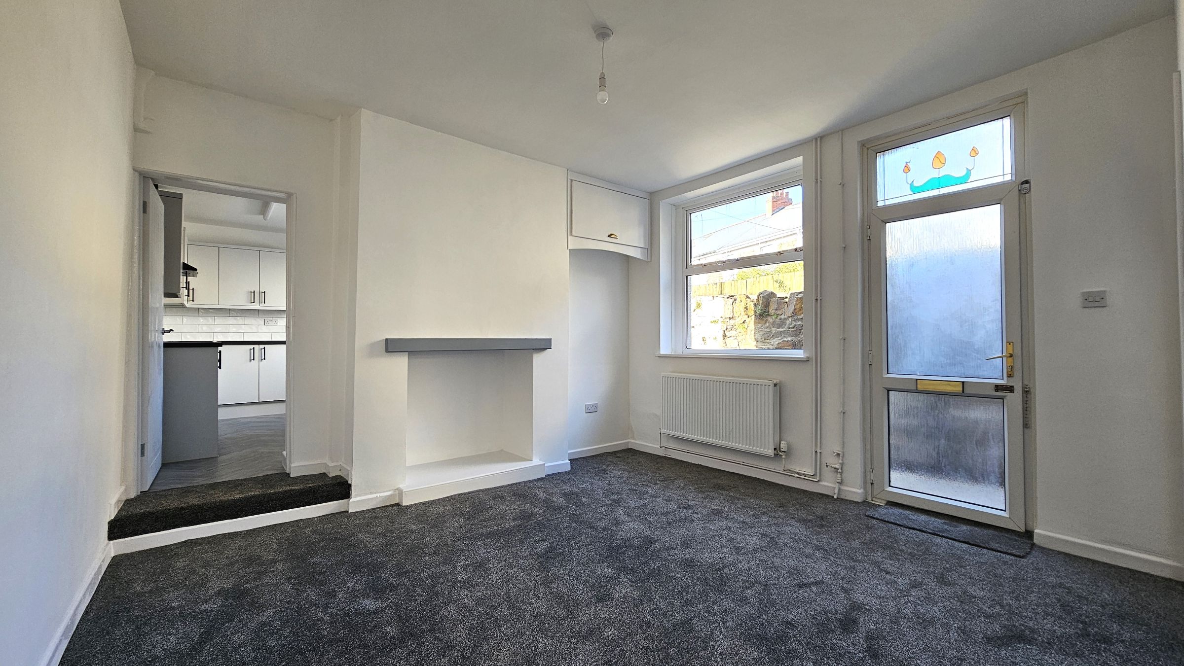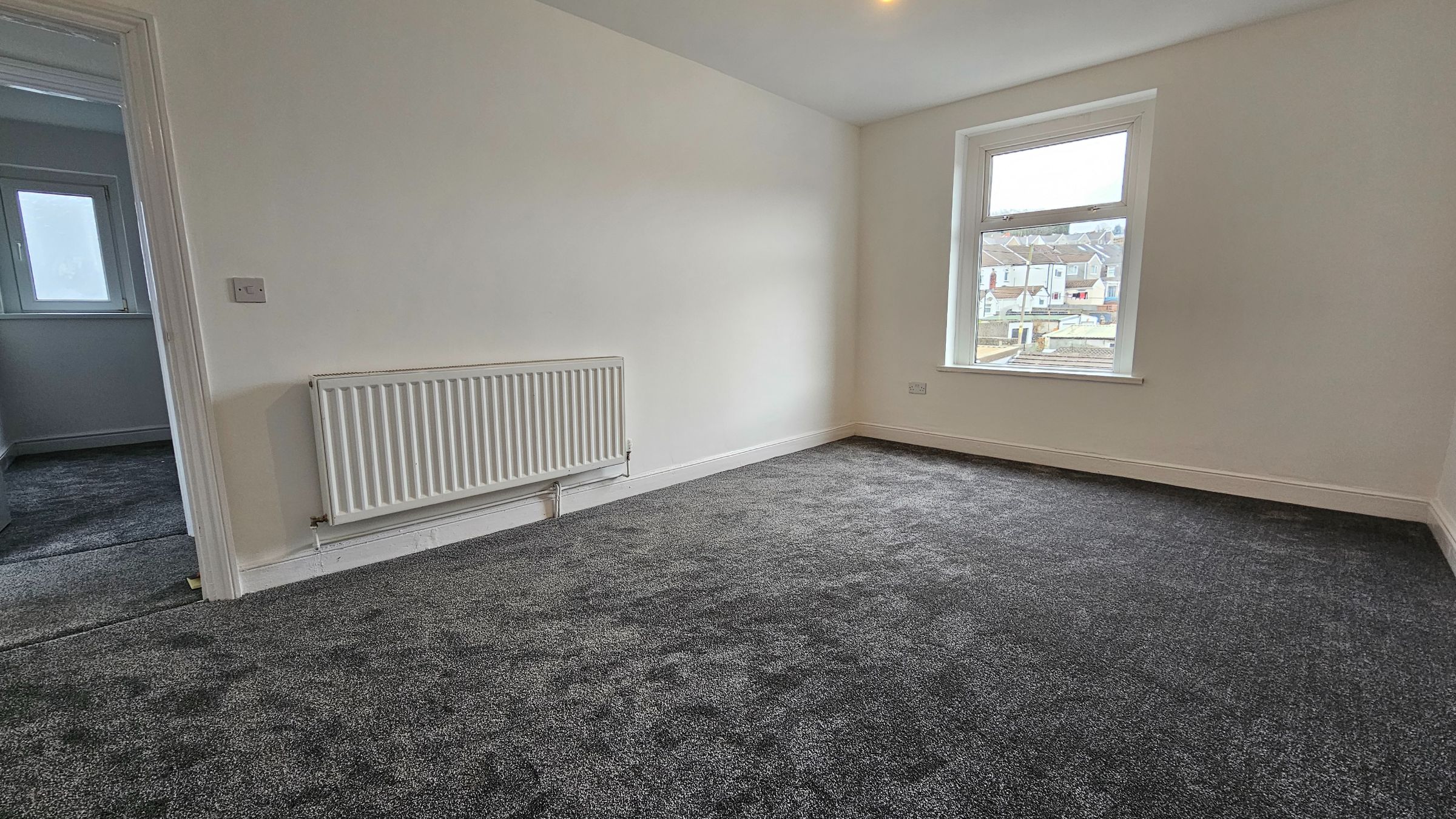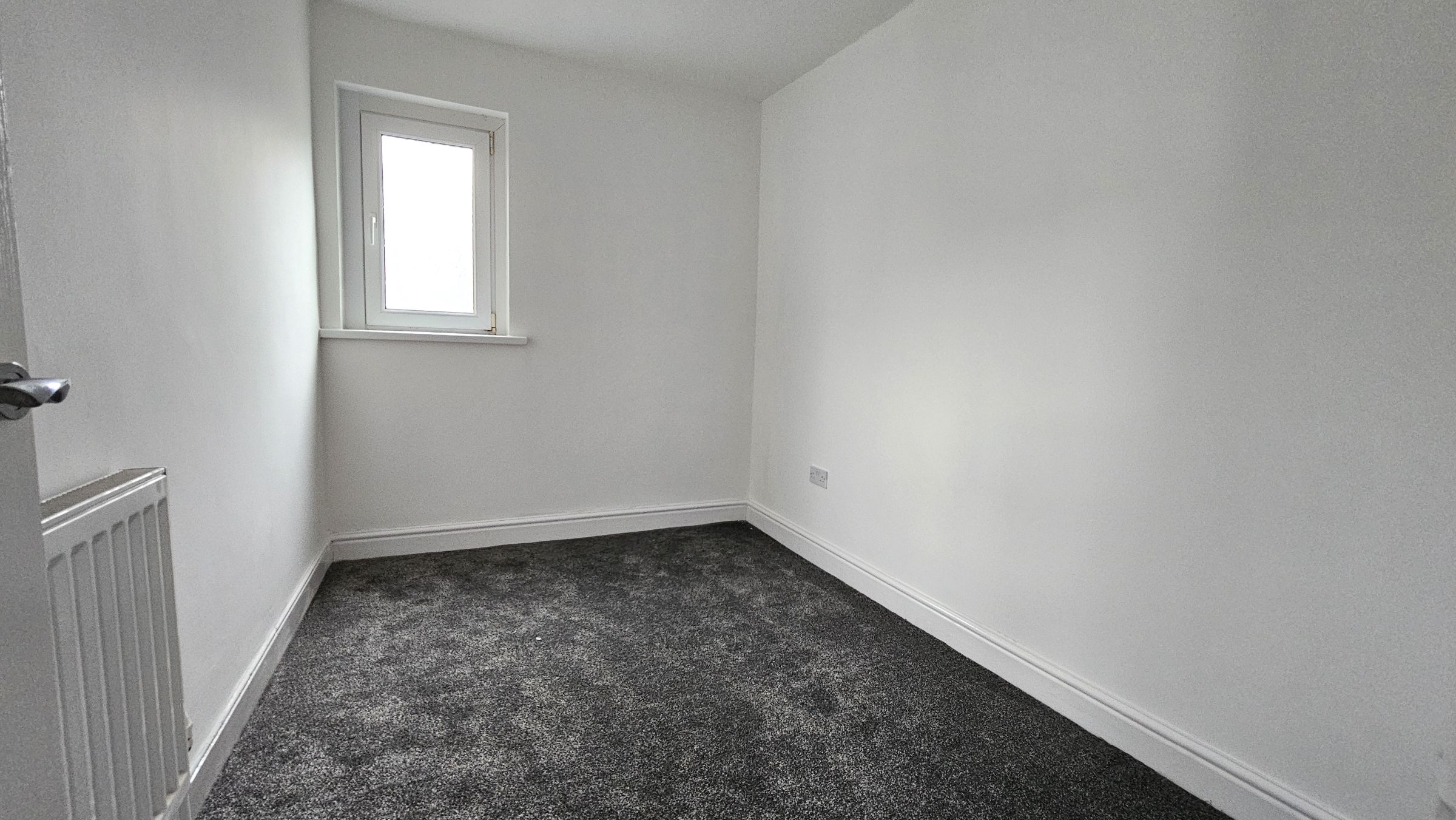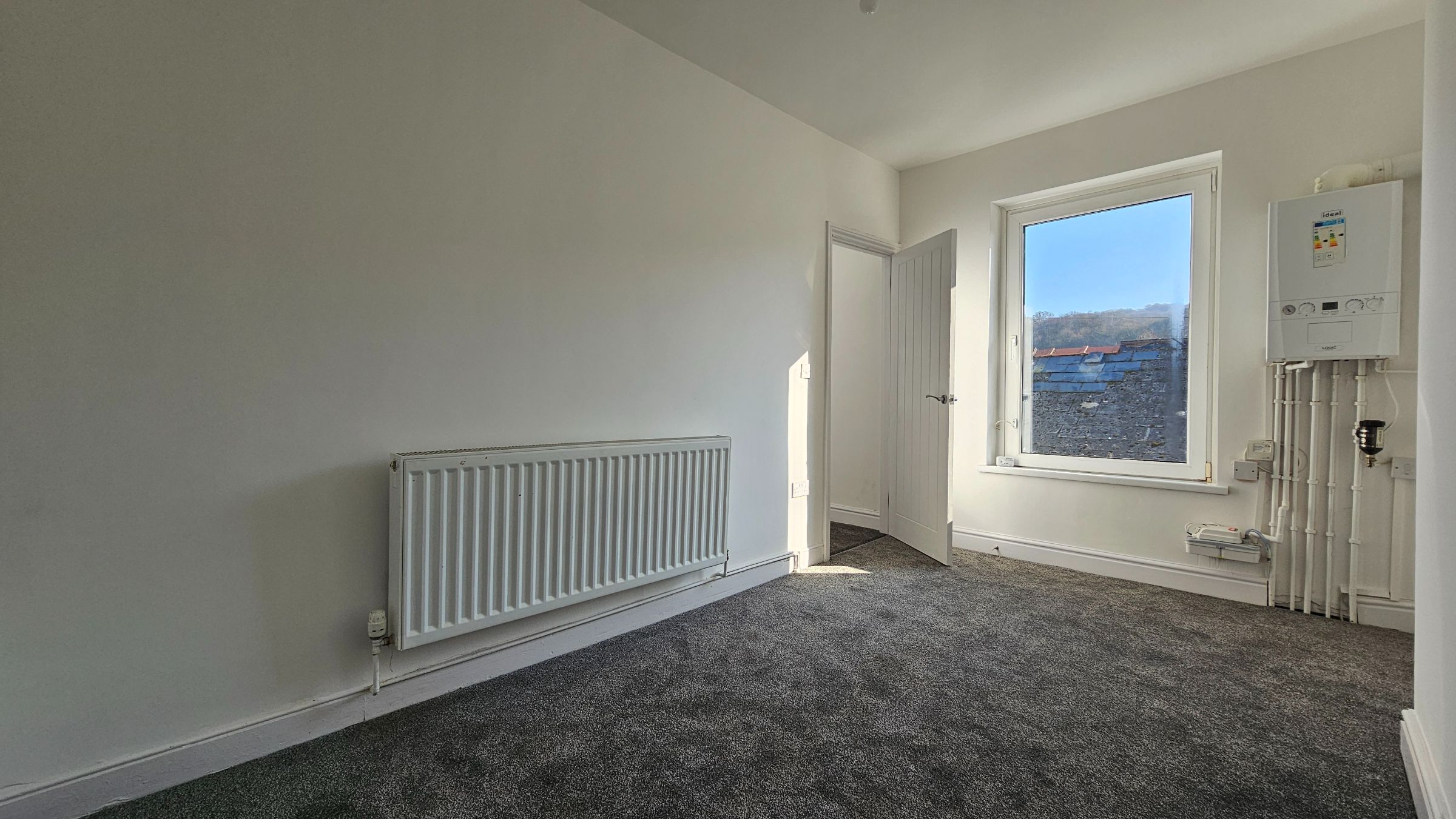 Smooth plastered walls and ceiling, newly fitted carpet, radiator, UPVC double glazed window and door to side.