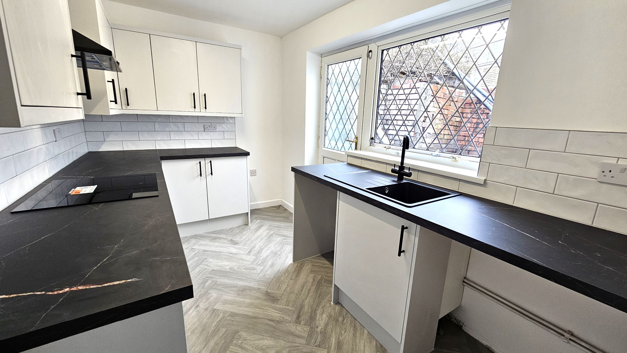 Smooth plastered walls and ceiling (tiled around worktops, newly fitted vinyl flooring, radiator, UPVC double glazed window and door to side.
