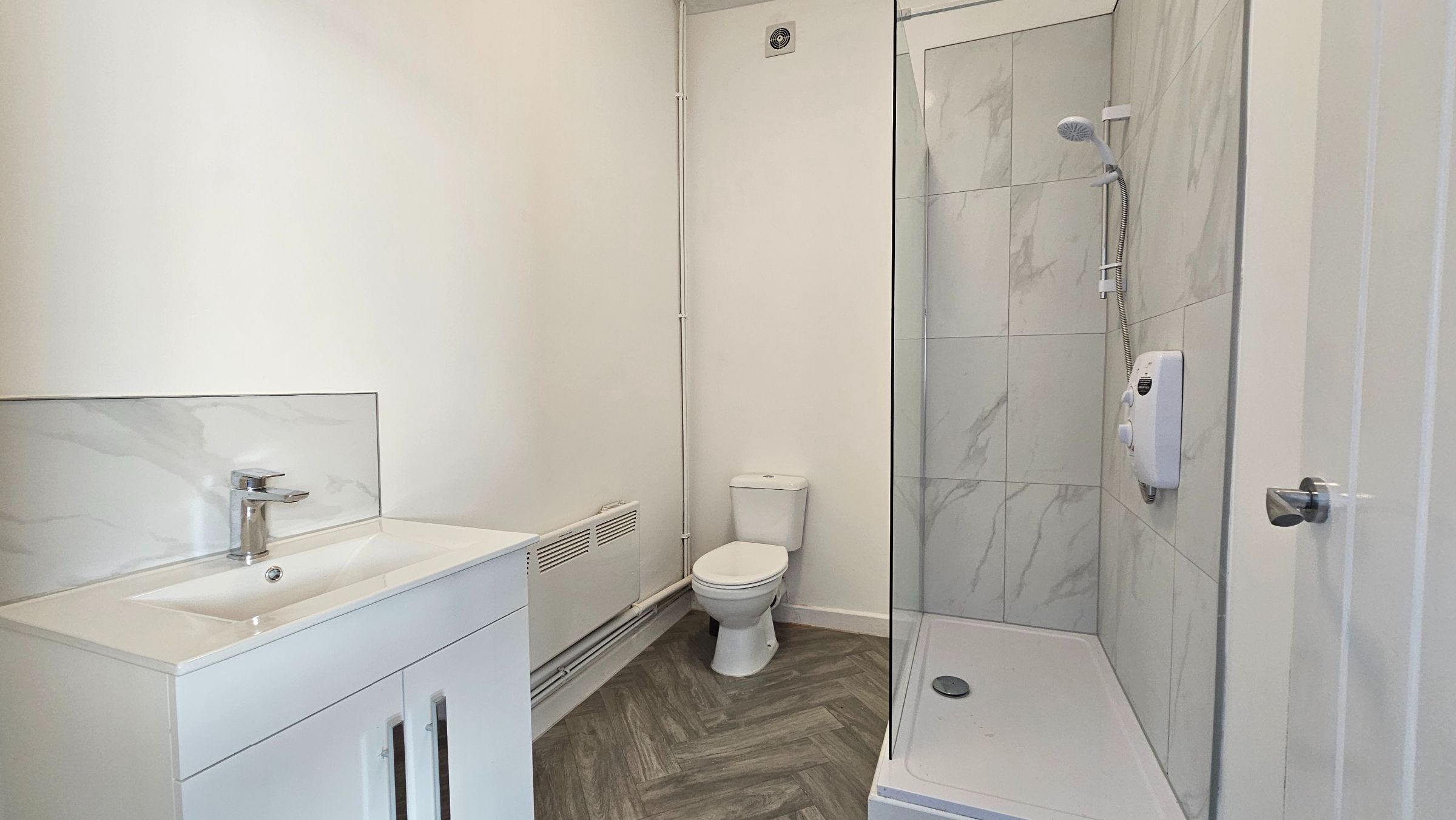 Bathroom suite comprises of a large shower enclosure with electric shower, vanity unit with washbasin, low level W.C