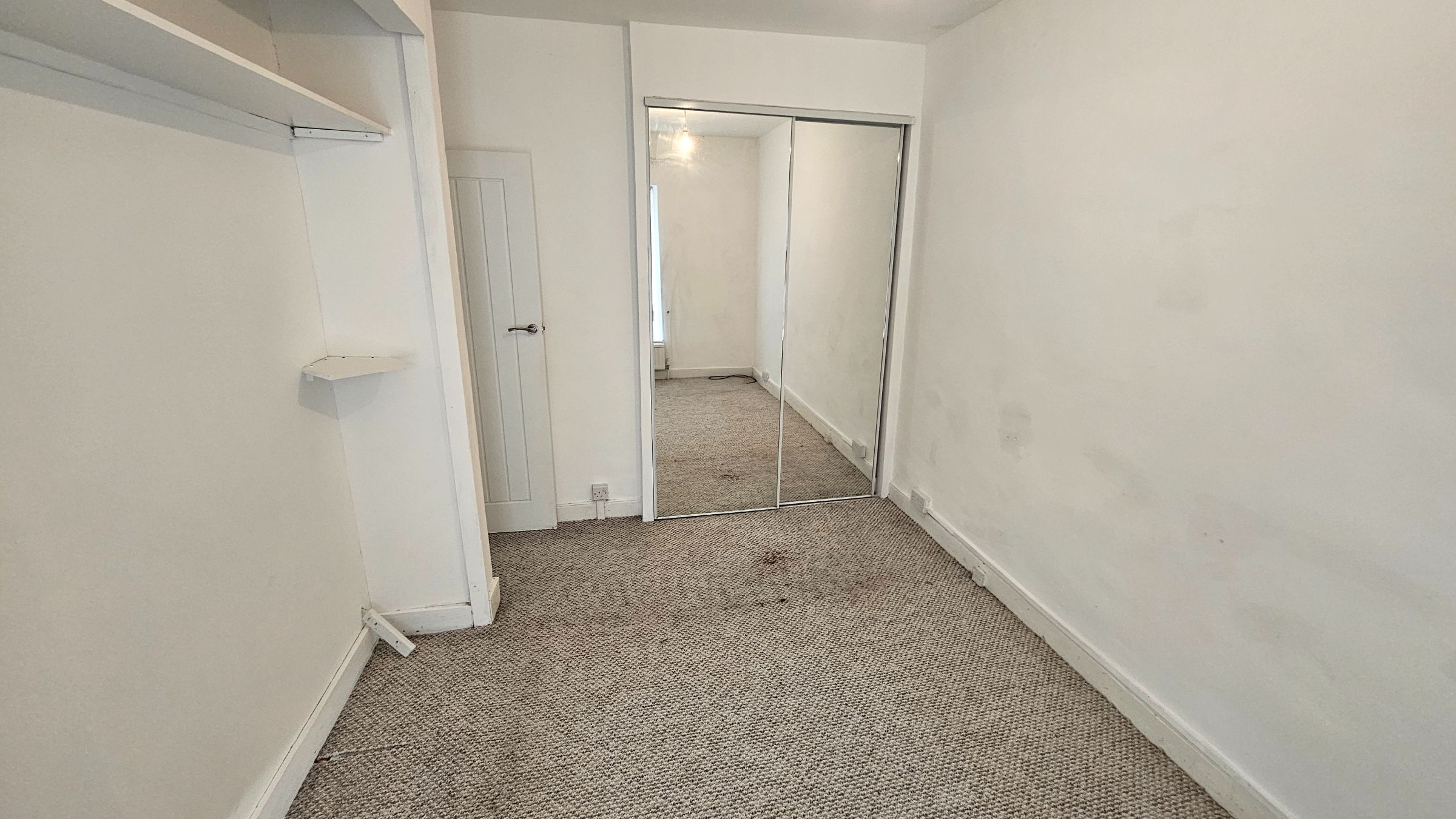 Smooth plastered ceiling and walls, carpet, radiator, UPVC double glazed window to front, large walk in wardrobe with sliding mirror doors