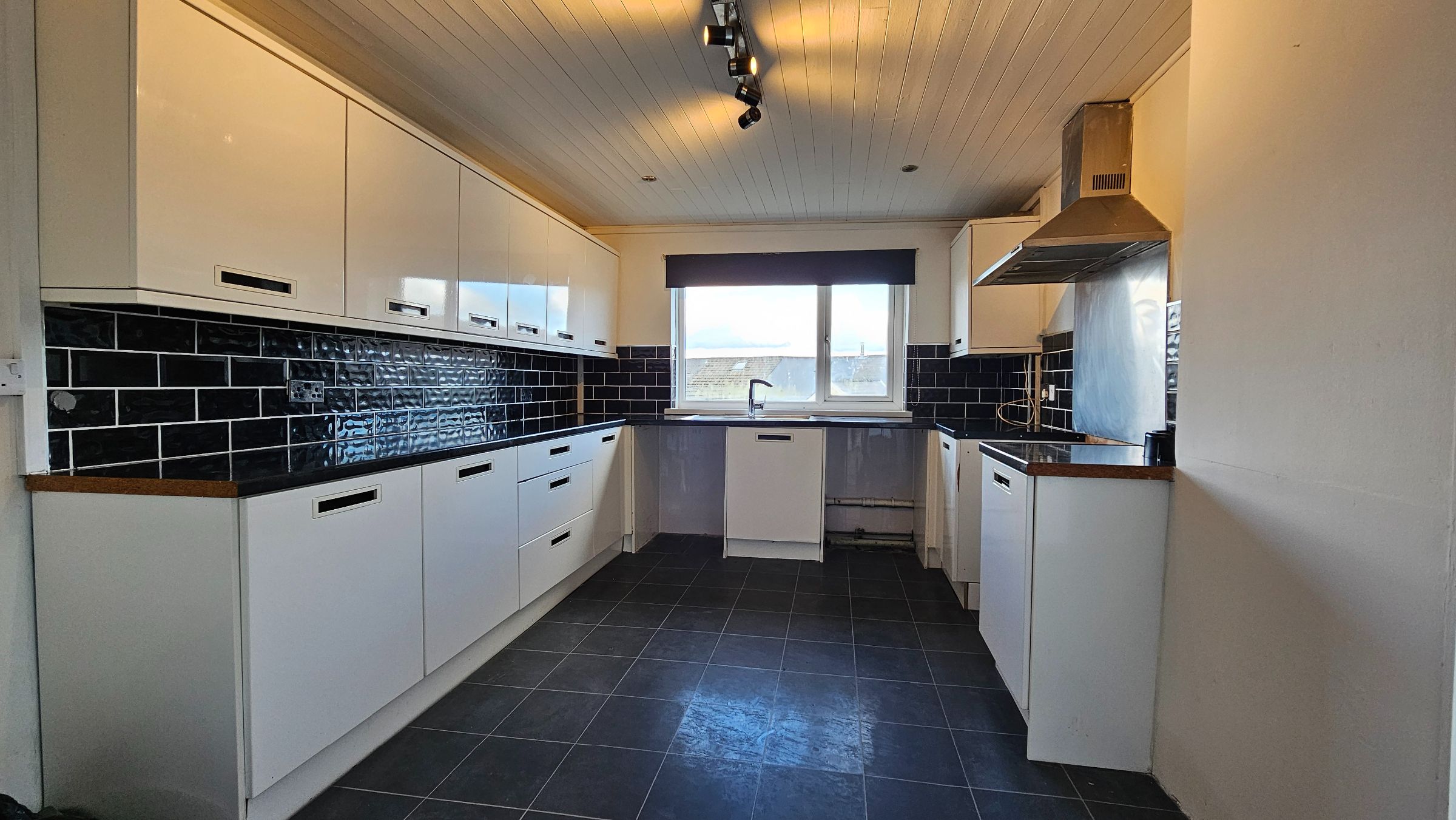 wood cladded ceiling smooth plaster/part tiled walls, tile effect laminate flooring, radiator, UPVC double glazed door to side and window to rear.