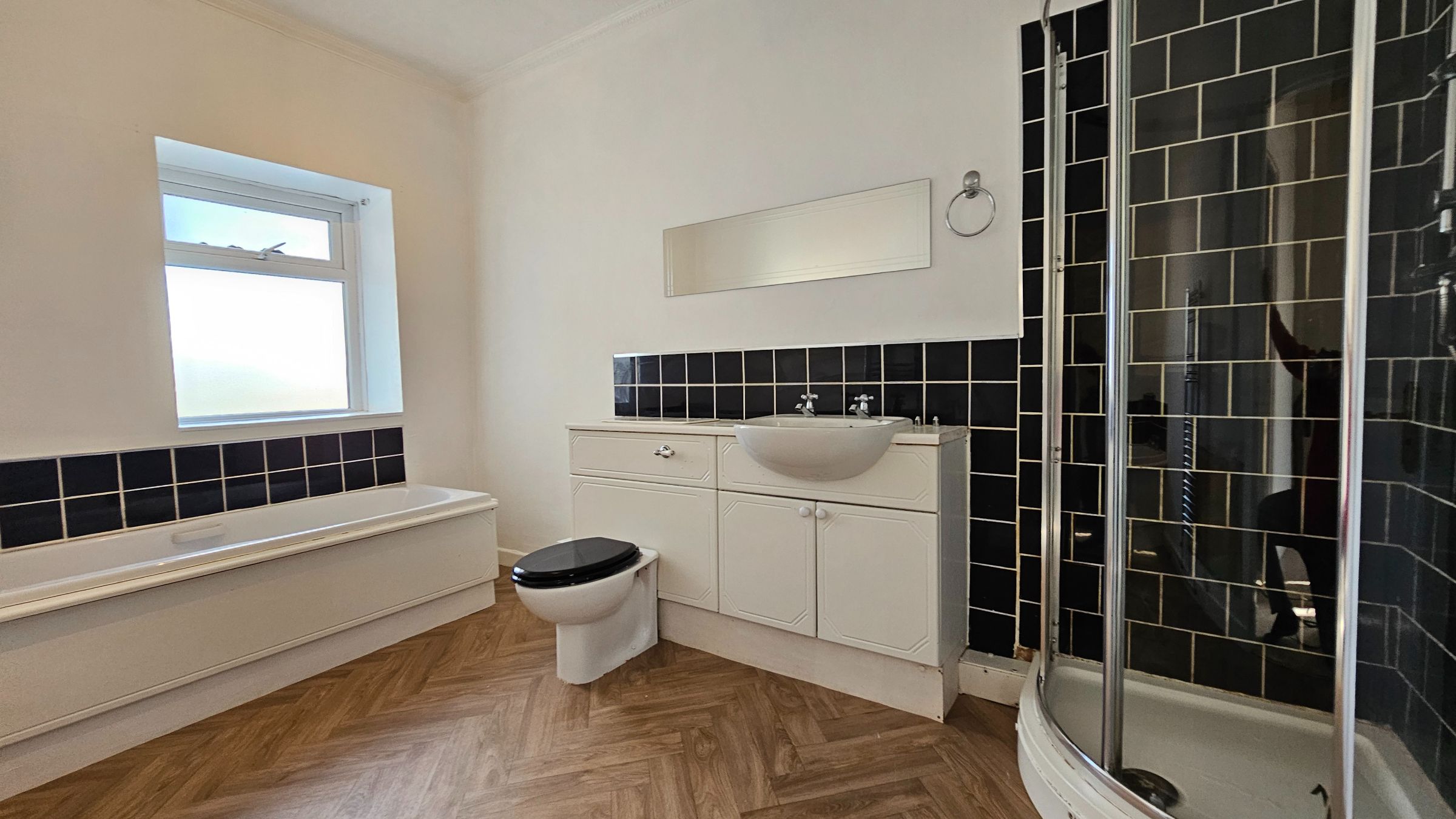 Smooth plastered ceiling and part tiled walls, newly fitted vinyl flooring, chrome towel radiator, UPVC double glazed window to rear.