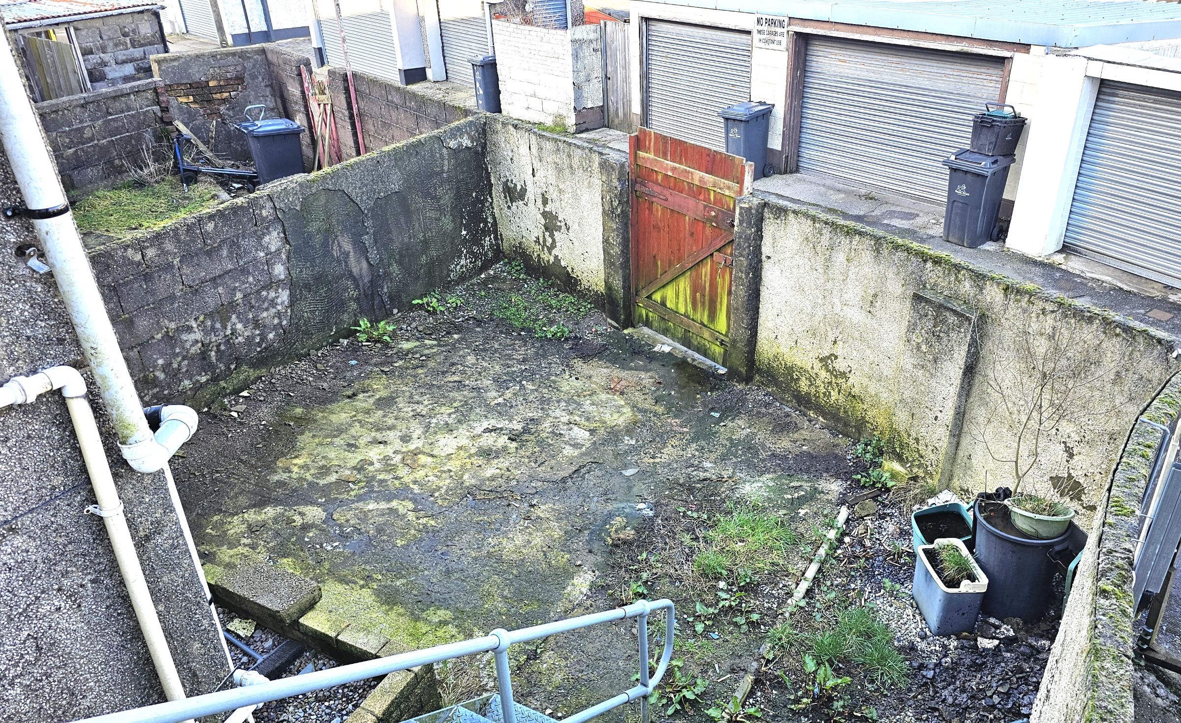 Enclosed area of hard standing accessed via stairs from the back door, gated rear access.