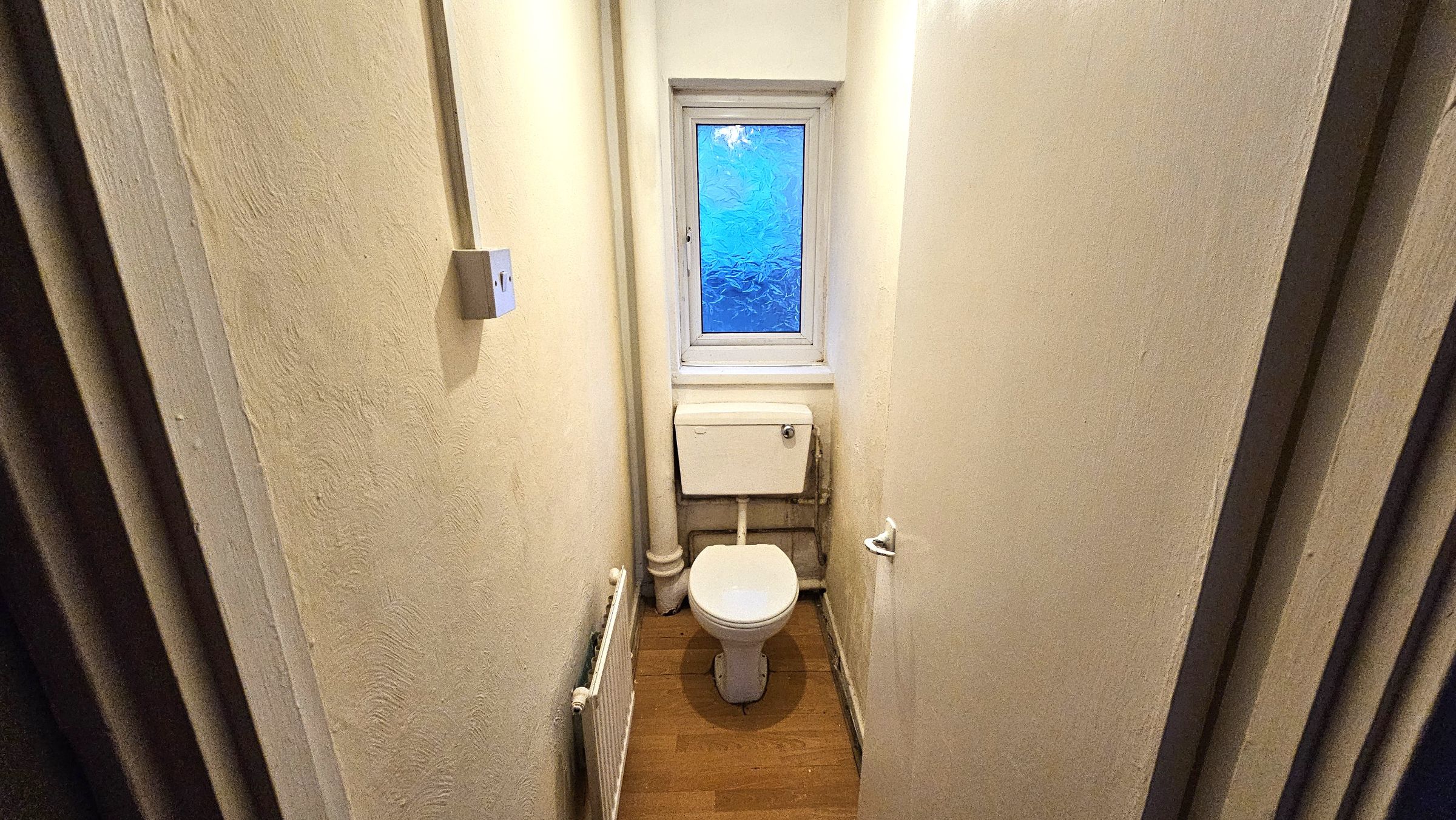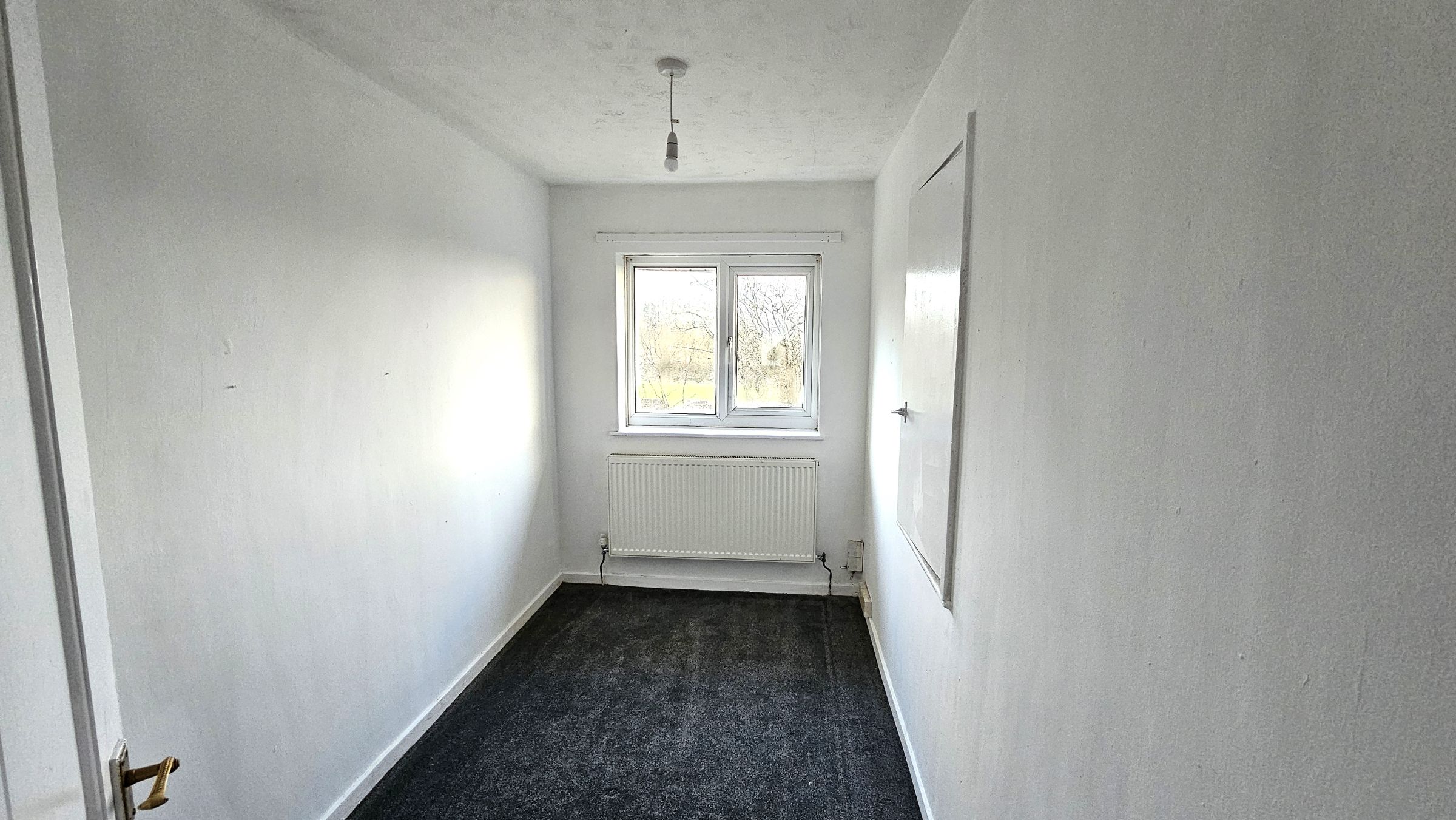Smooth plastered, part papered walls, carpet, radiator, double glazed window to front.